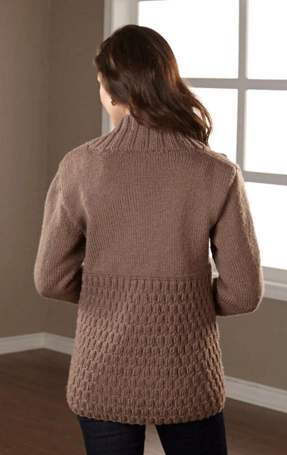 A cozy knit cardigan with lovely extended ribbing detail. Beautiful details continue on the back. Kit includes worsted weight Mary Maxim Starlette and pattern. Requires Knitting Needles 8 & 9 and 32″ Circular Needle size 8. Buttons not included.