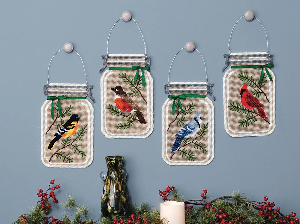 Bring these birds into your home with this beautiful kit. Kit includes 7 mesh plastic canvas, acrylic yarn, trims and pattern to make set of 4 as shown. Ribbon may vary. Size 7 x 10.5″.