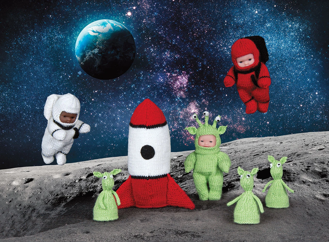 Out of this world adventures await for your young astronaut! Kit includes 5″ Lots of Love doll (your choice of Caucasian or African American) quantity 1, Mary Maxim Twinkle fingering weight yarn to make alien suit, baby aliens (3), white astronaut suit, red astronaut suit, rocket, and pattern. Requires Needles Size 2, Double Point Needles size 2 and Stitch Markers. Extra 5″ Lots of Love Dolls and Polyfill (required) sold separately.
