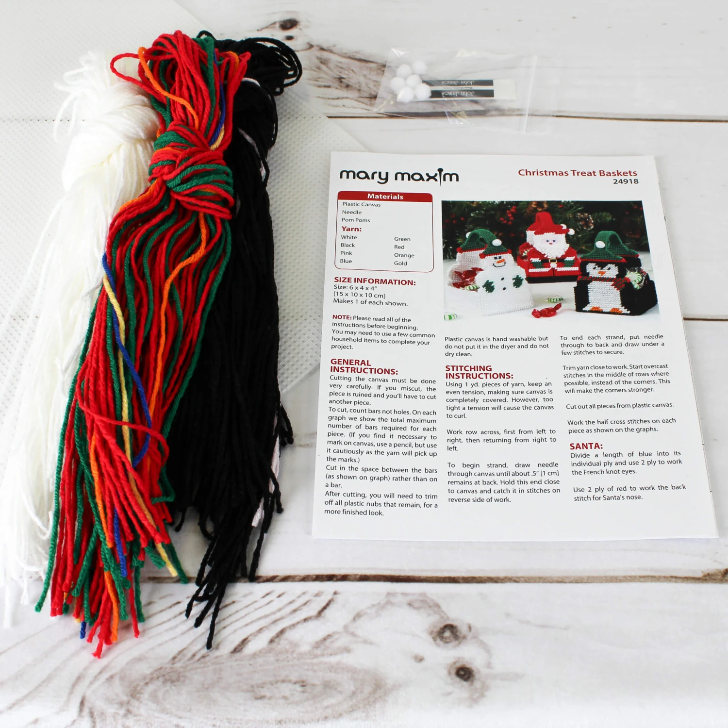 Enjoy your favorite sweet treat with these fun winter pals. This kit makes a Snowman, Santa, and Penguin Treat Basket. Place them strategically for convenient sweets or give one to a special person and let these delightful friends share a festive treat with family and friends. Kit includes 7 mesh plastic canvas, acrylic yarn and pattern to make 3. Size 4 x 4 x 6″.