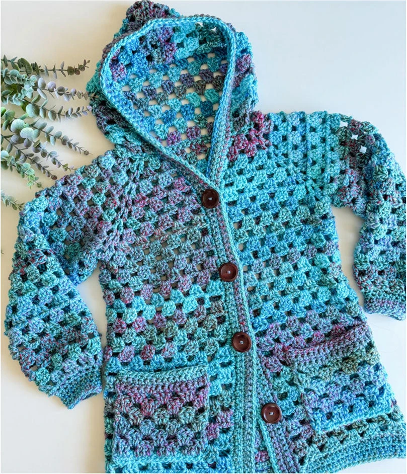 Designed by MJ’s Off The Hook. This versatile pattern includes directions for both short or long cardigan with hood. Kit includes Mary Maxim Marvelous Chunky yarn and pattern. Buttons not included. Requires crochet hooks K-10.5 and size N. Intermediate Crochet.