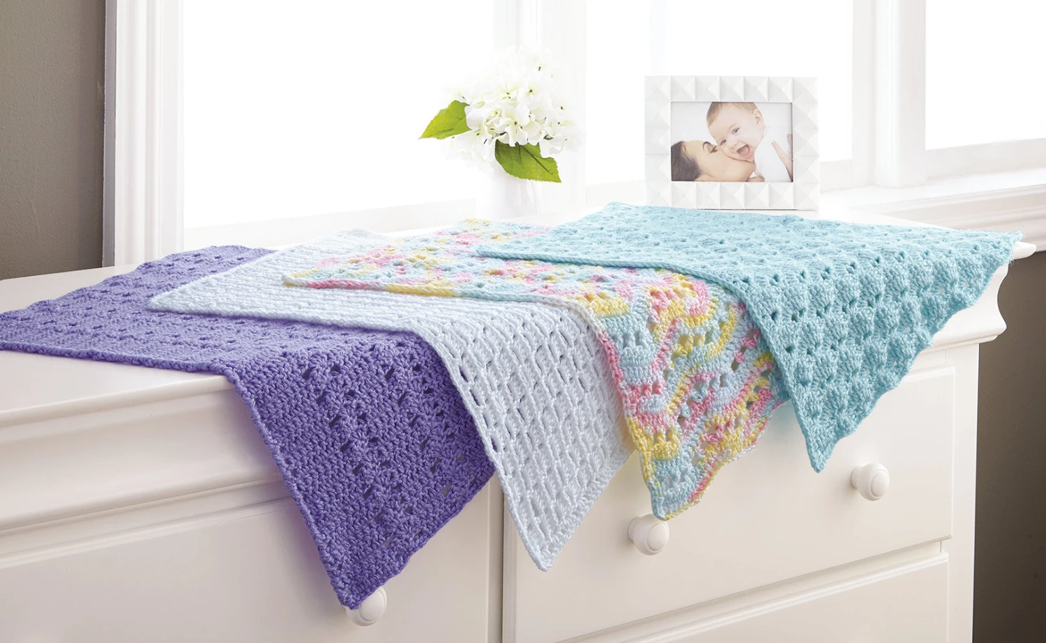 Four lovely crochet baby blanket designs, great to give as gifts. Kit includes Mary Maxim Baby Value worsted weight yarn and pattern to make all as shown. Requires Crochet Hook Size H-8 (5.00 mm).
