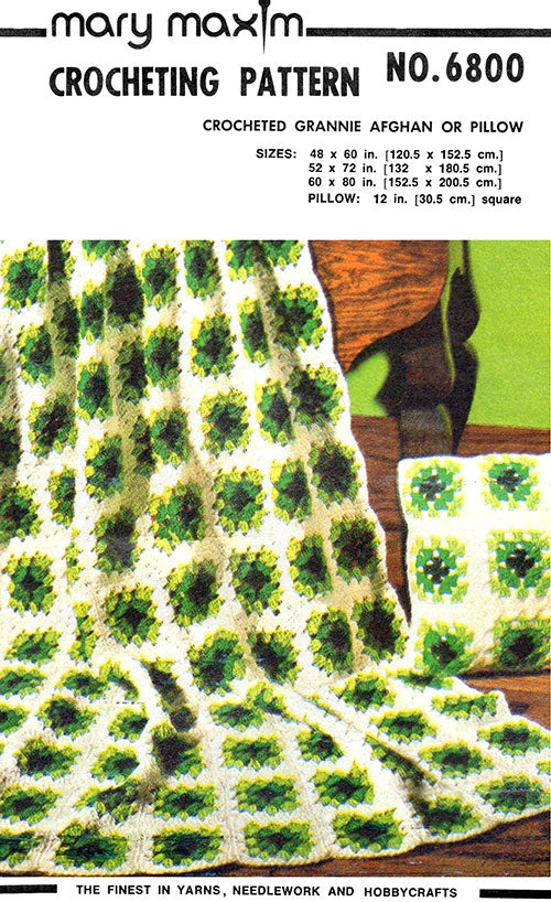 Crochet a classic afghan and pillow set using this vintage pattern. A traditional favorite with young and old. It’s so easy and fast to crochet the separate Mellowspun granny squares you sew together to finish. Originally created with Mary Maxim Mellowspun Orlon, which had 420 yards per skein. You will find Mary Maxim Mellowspun and all the current sport weight yarn selections, here. Please note, yardages may have changed.