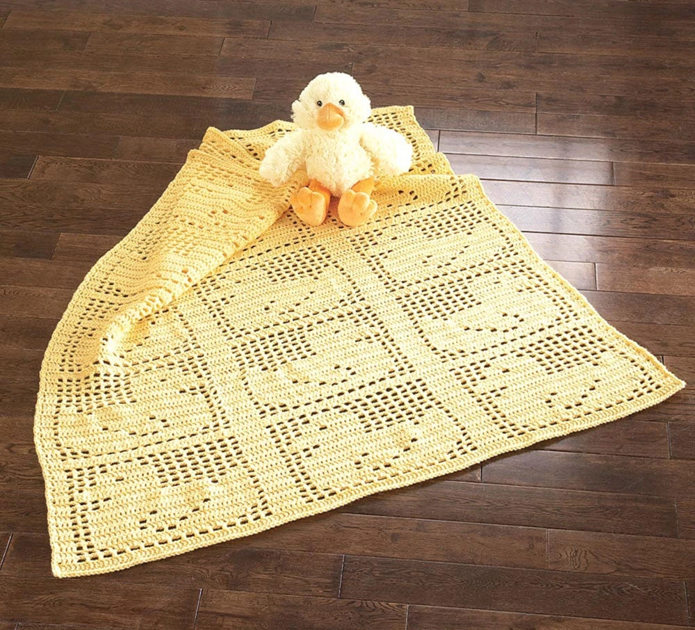 Designed by Lucille Mayes. Adorable duckies for your little one. Kit includes Mary Maxim Starlette yarn. Requires crochet hook H-8. Size 38.5 x 43.5″. Intermediate crochet.