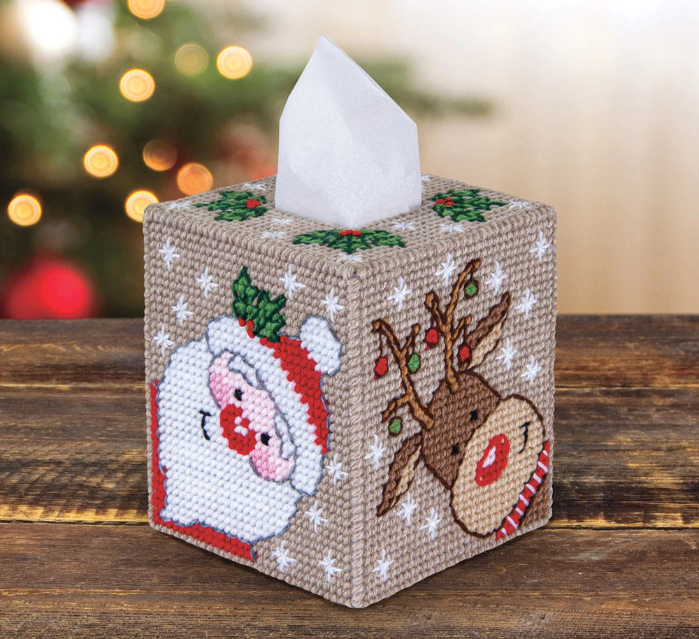 These adorable friends are ready for the holiday season. Kit includes 7 mesh plastic canvas, acrylic yarn and pattern to fit boutique size tissue box.