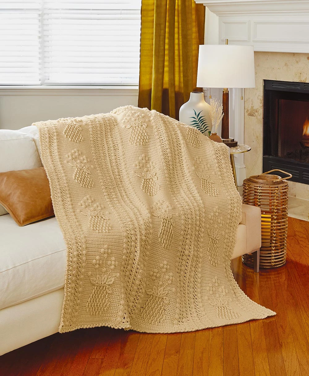 2nd place contest winner! No details left out! This beautiful Florist Shoppe Afghan is designed by Dorothy Warrell and features gorgeous pineapples and bouquets to crochet. Kit includes Mary Maxim Starlette yarn and pattern. Size 44″ (111.76 cm) x 64″ (162.56 cm). Requires Crochet Hooks F-5 and H-8.
