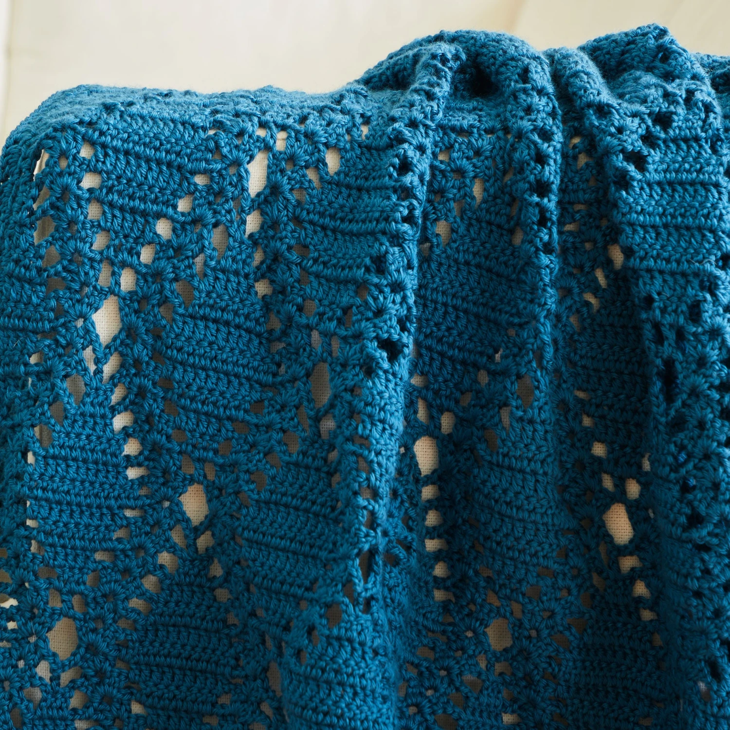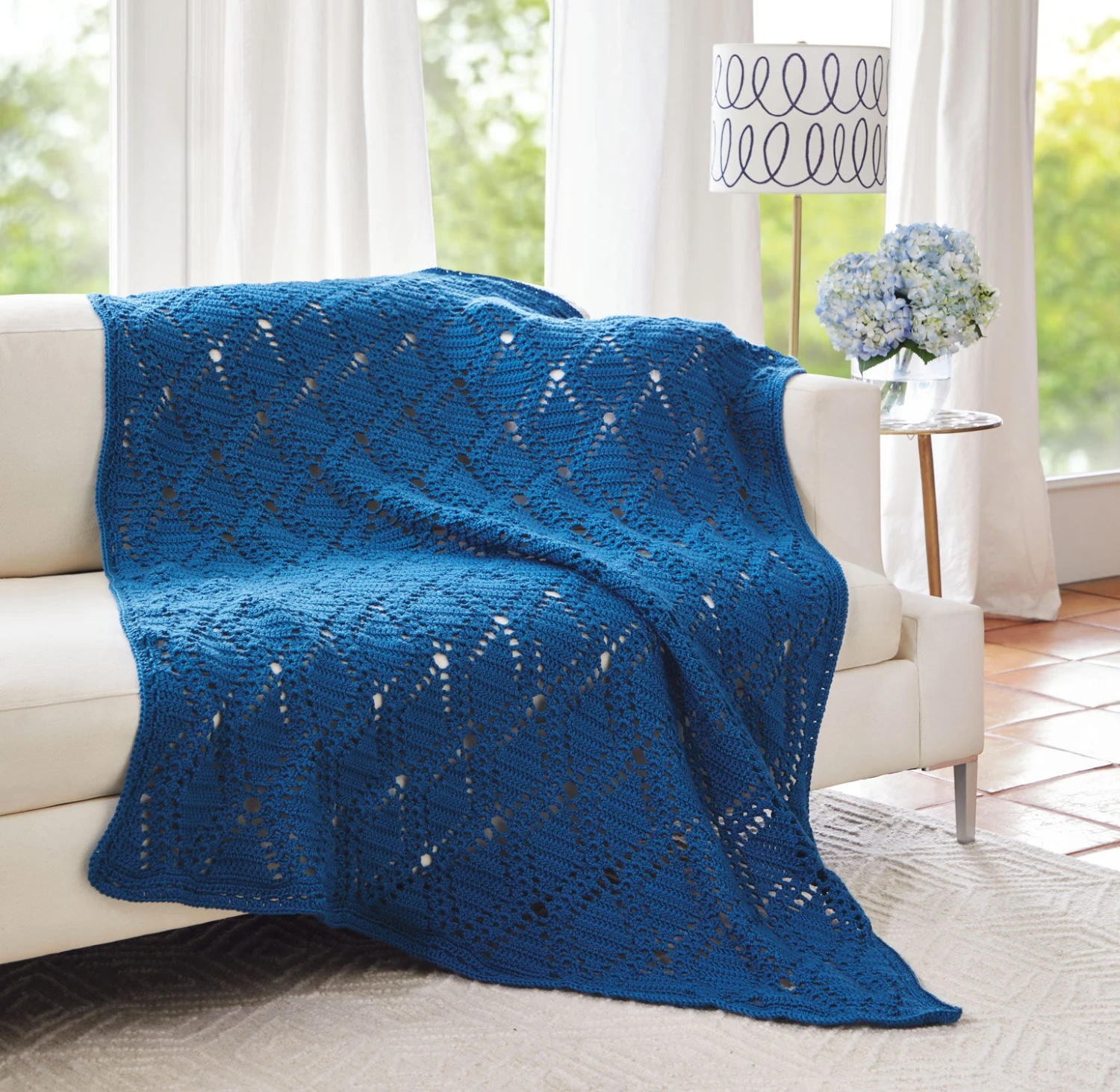 A silky soft throw with a classic diamond filet pattern. Kit includes Caron Simply Soft yarn and pattern. Requires crochet hook H-8 (5 mm). Size 42″ x 59.5″. Intermediate crochet.