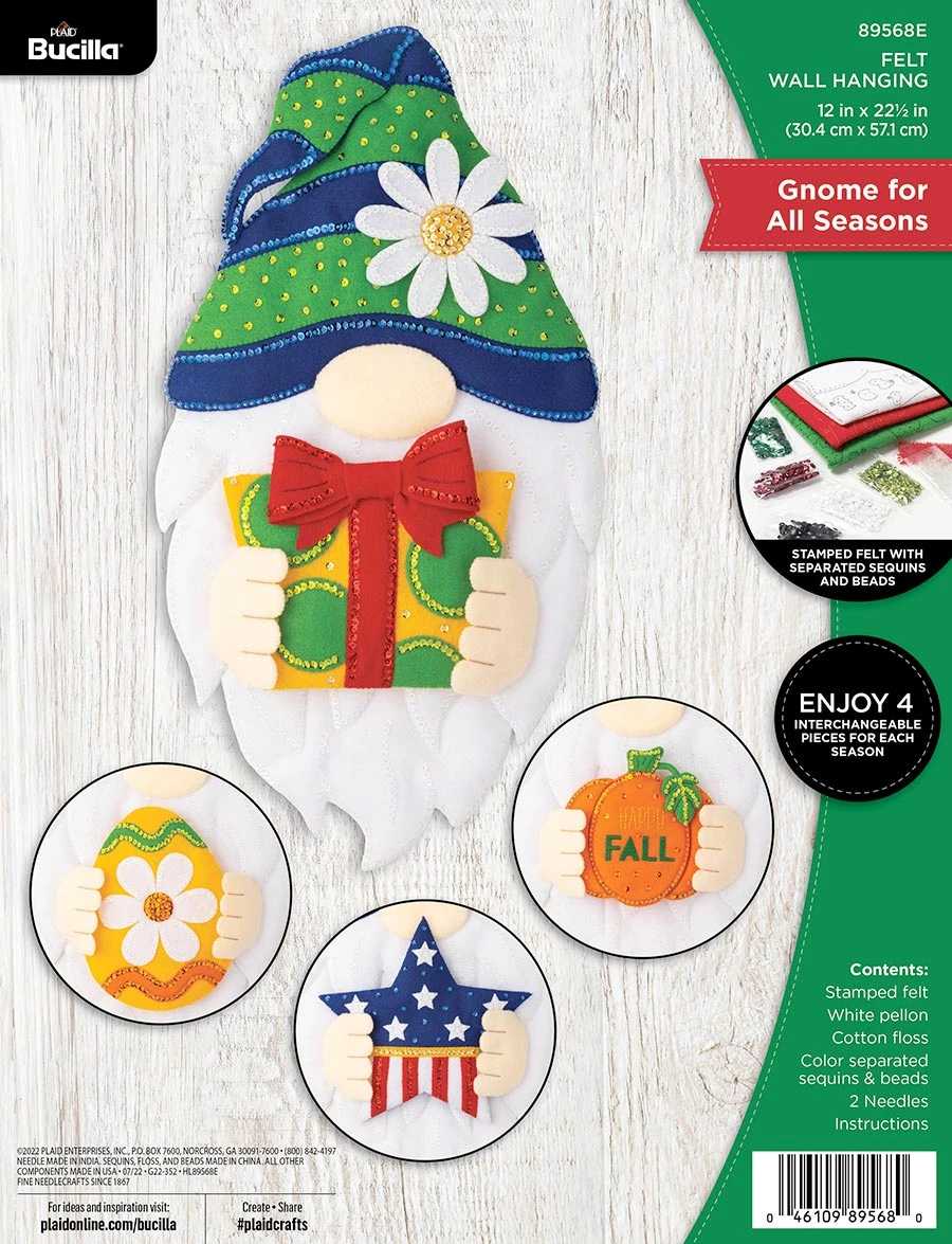 Make your holidays unique with the Bucilla Gnome for All Seasons Wall Hanging Kit. This set of features a gnome with four different ornaments to hold for holidays throughout the year. This embroidery kit includes stamped felt, cotton embroidery floss, color-separated sequins, and beads, two needles, and instructions. Whether you have been stitching for years or you are looking to learn a new skill, Bucilla provides the products and education for every interest and skill level. Add the Bucilla Christmas Gnome Ornament set to your holiday decor for a playful addition to your Christmas tree. Add a fun touch to your holiday traditions with the Bucilla Gnome for All Seasons Wall Hanging Kit. Size 12″ x 22.5″.