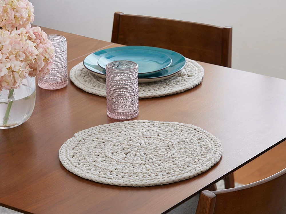 A beautiful addition to any dinner table. Kit includes Mary Maxim Home yarn. Requires crochet hook J-10 (6 mm). Size 14″ diameter. Makes set of 4. Intermediate crochet.