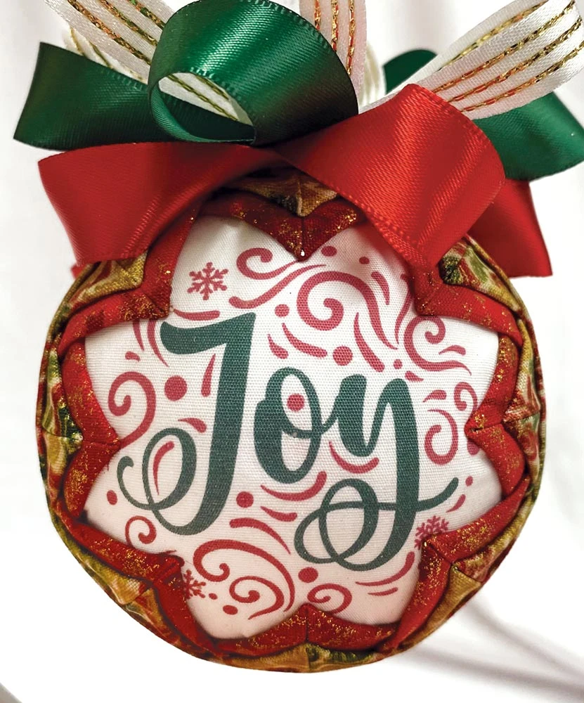 This unique quilted ornament looks hand sewn, but it’s not! No sewing required. Simply fold fabric and pin in place with easy to follow instructions. Kit includes foam ball and all materials to make one ornament as shown. Size 3″ diameter.