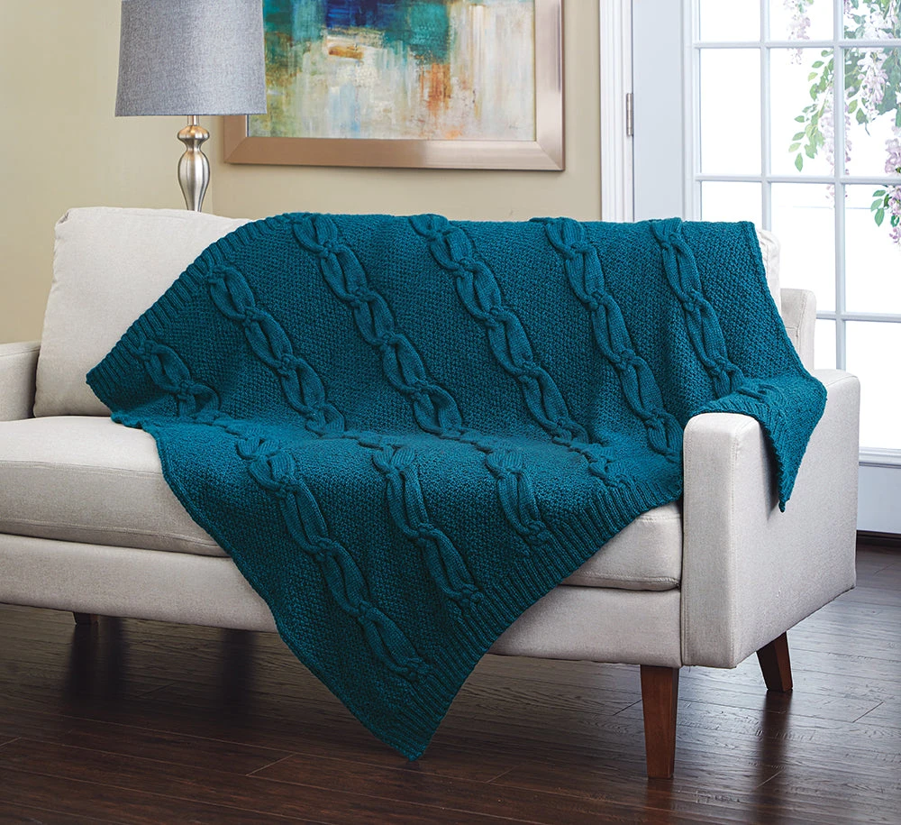 Bold cables with simple texture create this silky soft throw. For the intermediate knitter, this cabled design will add a warm and inviting look to your home. The Knotted Cable Throw kit to knit is worked back and forth on a circular needle, using Double Moss Stitch and a 26 stitch Cable Panel. Includes easy-to-follow pattern with a close-up photo of Knotted Cable panel and Mary Maxim 100% acrylic premium worsted weight Best Value yarn. Shown in Deep Teal.ย Finished size 51″x 54″.ย ย Requires 36″ Circular Knitting Needle size 9, Stitch Markers and Cable Needle.