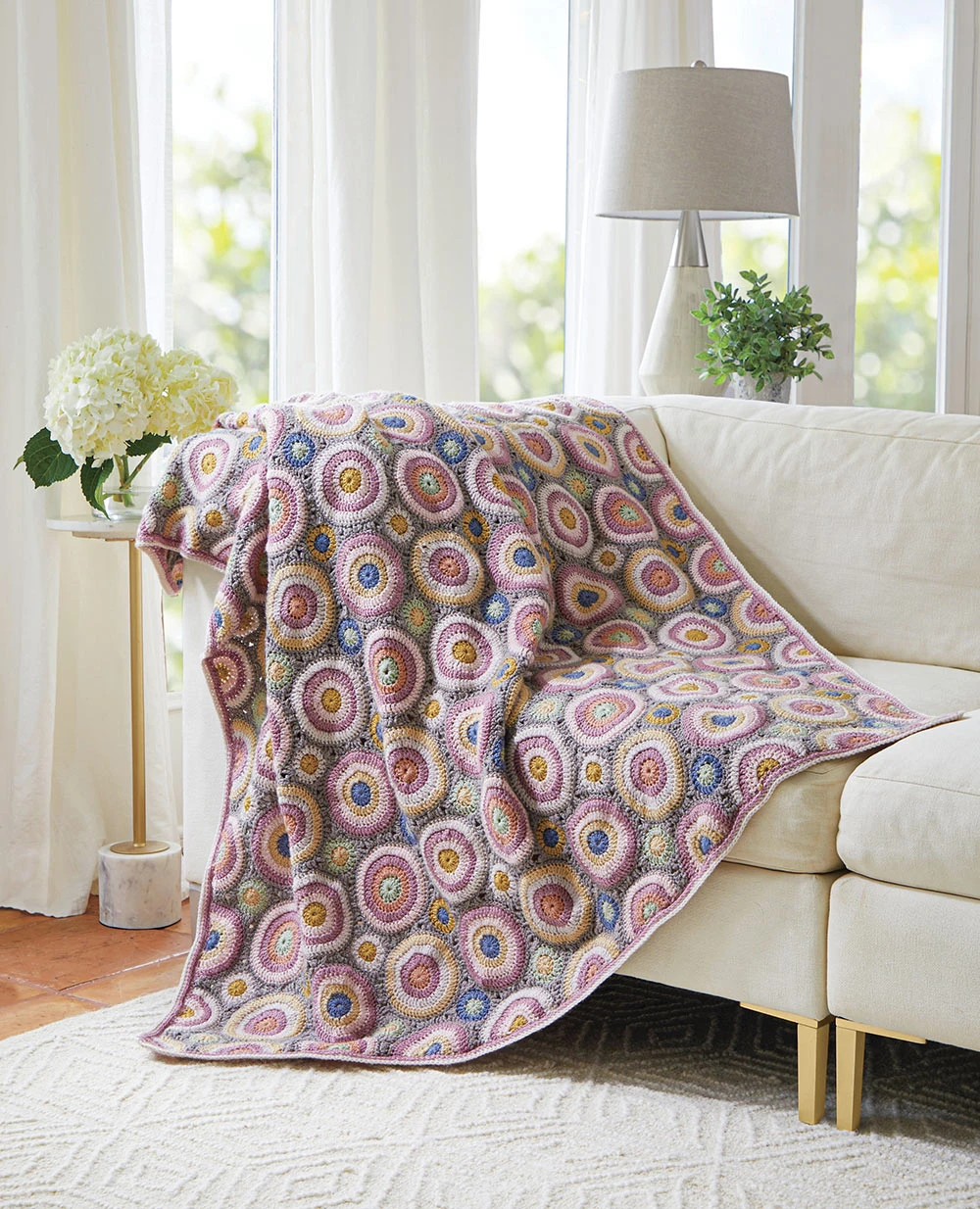 Designed by Janie Crow. A stunning display of soft, relaxing colors in circular motifs that are joined together. Kit includes Mary Maxim Mellowspun DK yarn and pattern. Requires crochet hooks E-4 (3.5 mm) and G-6 (4 mm). Size 46.5″ x 46.5″. Skill level: advanced crochet.