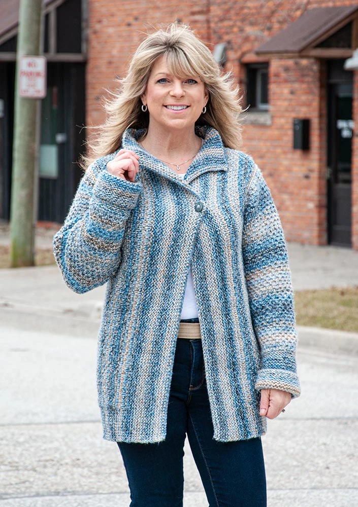This cozy jacket knit from side to side adds a splash color to your wardrobe. Kit includes Mary Maxim Marvelous Chunky yarn. Requires 24″ (60 cm) circular needle size 9 (5.5 mm). Buttons not included. Intermediate knit. Finished chest sizes: Small 37″, Medium 41″, Large 45″, XL 47″, 2XL 52″.