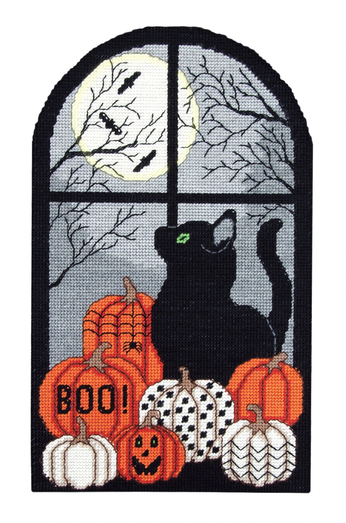 This cat is mesmerized by the moon. Kit includes 7 mesh plastic canvas, acrylic yarn and pattern. Size 13.5 x 23″.
