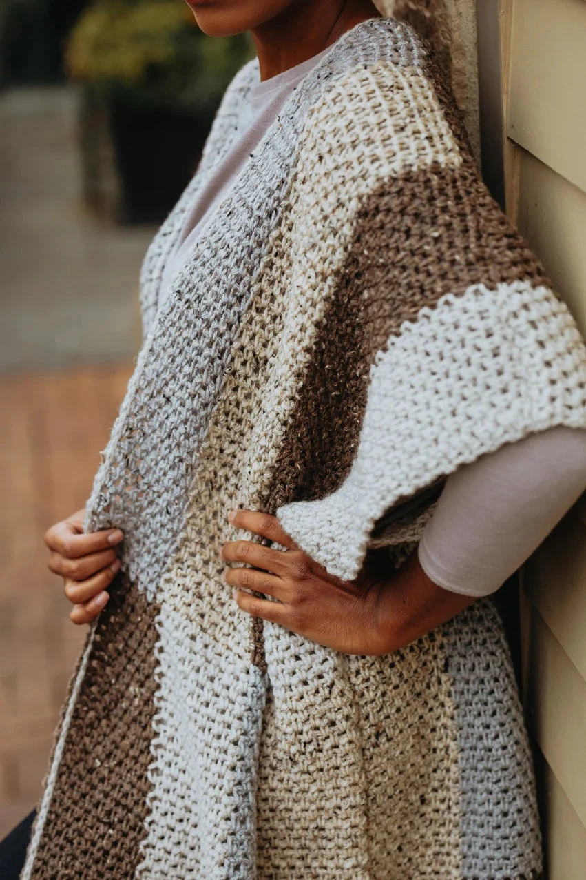 A trendy cardigan in neutral colors and subtle details. Make a bold style statement in this Patchwork Cardi. Its eye-catching tassels and open front ensure a look you’ll always stand out in. Crafted with short sleeves and a long body for easy layering, this statement piece will take your fashion game to the next level! Designed by TL Yarn Crafts. Kit includes Lion Brand Vanna’s Choice yarns and instructions. Requires crochet hook size 7.0 mm. One size fits most adults. Size 34 x 39″. Intermediate Crochet.