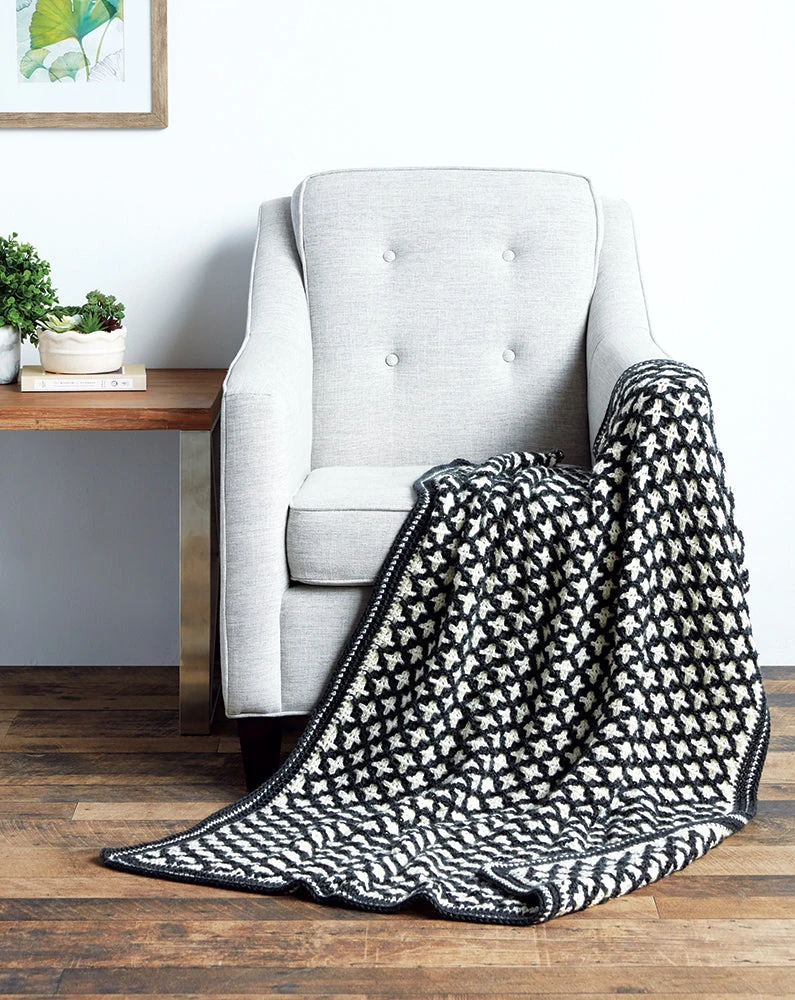 This project is perfect for the on the go crafter!Ā Interlocking stitches create this interesting geometric pattern. Kit includes Caron Simply Soft yarn and pattern.Ā Finished sizeĀ 38″ (96.52 cm) x 46″ (116.84 cm).Ā RequiresĀ I-9 (5.5 mm).Ā Ā