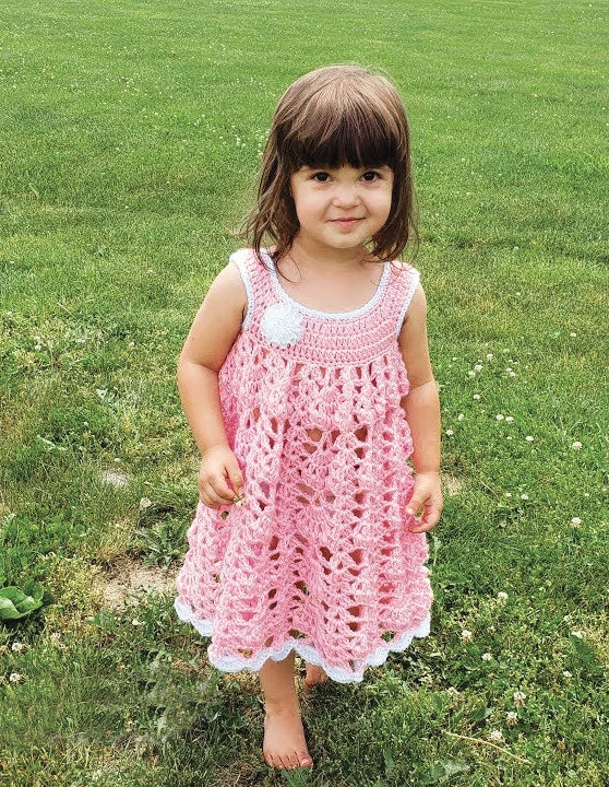 Designed by Bag-O-Day Crochet. A beautiful dress with white trim and flower accent. Kit includes Caron Simply Soft yarn and pattern. Requires crochet hook I-9. Sizes 3-5 years.