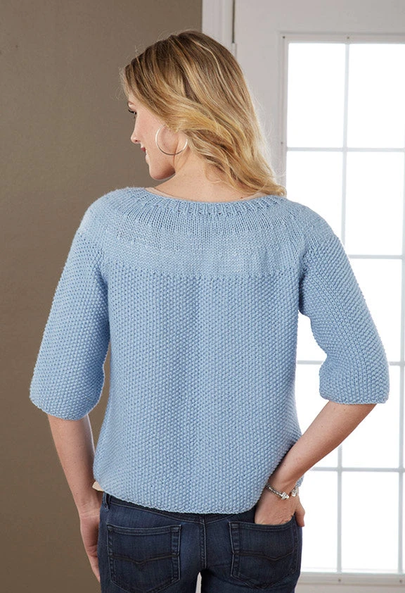 This Simple Yoke Cardigan with 3/4 sleeve, will be just enough for those days when you need something on your shoulders, but not too much. Kit includes Mary Maxim Starlette and pattern. Buttons not included. Requires 32″ Circular Needle Size 8 and Stitch Markers.