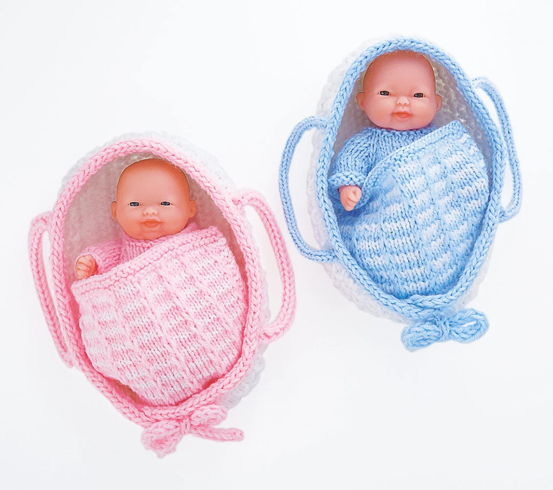 Nap time is more fun with this adorable doll kit! Kit includes Mary Maxim Twinkle yarn, pattern, and one 5″ Lot of Love Doll to make 2 baskets, 2 blankets and 2 outfits. Additional 5″ Lots of Love Caucasian and African American Dolls available. Requires 16″ (40 cm) Circular Needle Size 2 (2.75 mm), Single Point Needle Size 2 (2.75 mm) and Stitch Markers.