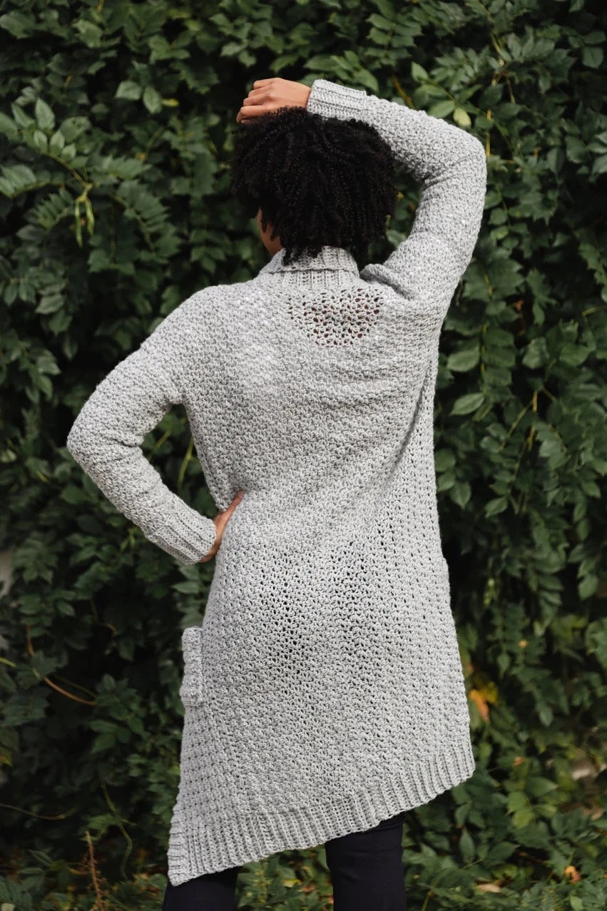 Slim-fit cardi with wide folding shawl collar and generous front pockets. Long body and sleeves will keep your whole body warm and comfortable. The perfect cardi to snuggle up on the sofa with a good book or watch a great movie. It’s the perfect cardi for any look, all season long. Enjoy comfort and style combined into one eye-catching piece. Designed by TL Yarn Crafts. Kit includes Mary Maxim Starlette yarn and instructions. Requires crochet hooks J-10 (6 mm) and 7 mm. Sizes small – XL. Intermediate crochet.