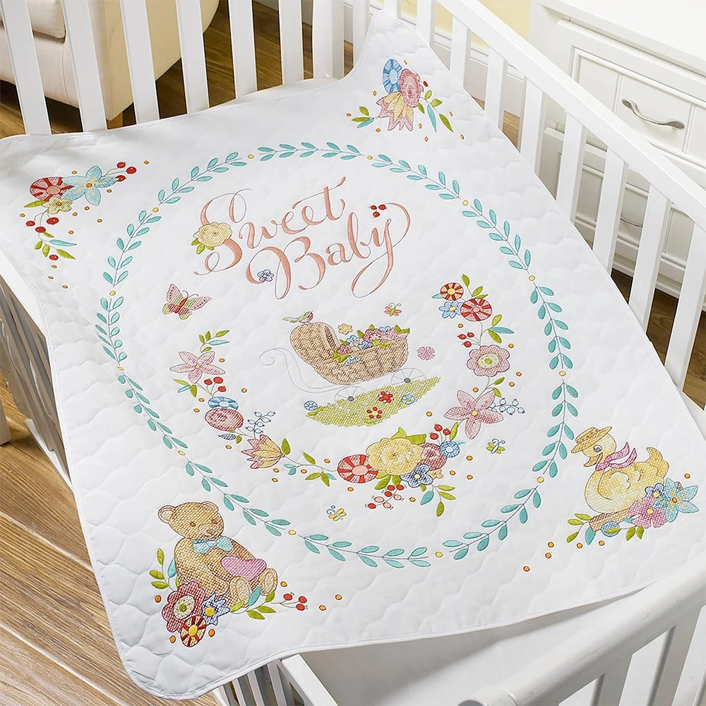This adorable quilt cover makes a wonderful gift to accompany any nursery decor. Kit includes pre-quilted/pre-finished 70% polyester/30% cotton fabric stamped in washable blue ink, 100% cotton embroidery floss, needle and instructions. Size 34″ x 43″.