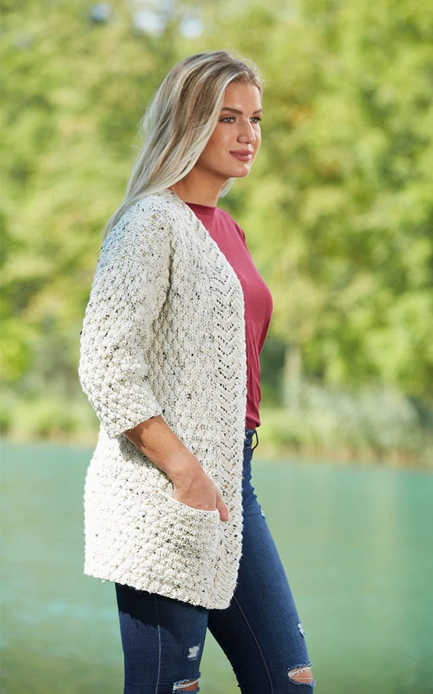 A little bit of lace and a 3/4 sleeve lends great versatility to this open-front sweater. Kit includes your choice of Mary Maxim Aran Irish Tweed or Mary Maxim Aran Irish Twist yarn. (Shown in Tweed) and pattern. Finished sizes Small – 2XL. Requires 32″ Circular Needle Size 10 (6 mm) and 32″ Circular Needle Size 10.5 (6.5 mm) and Stitch Markers.