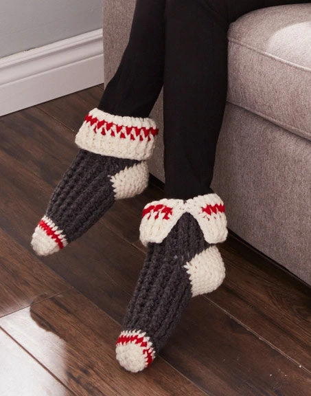 Keep your feet warm in these cozy slippers. Kit includes Titan yarn. Shown in (880) Med Grey/Natural/Red.